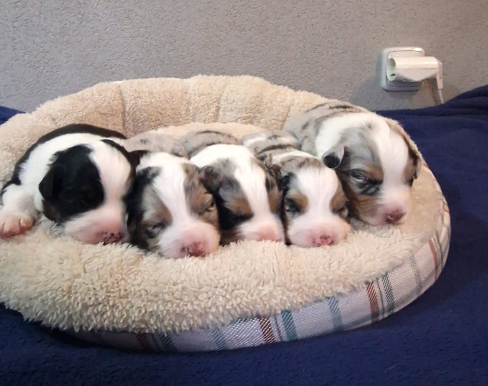 Štěňátkům jsou 4 dny, velmi dobře prospívají, přibírají a rostou. Zjistili jsme ,že Cilinka je výborná maminka nato ,že má miminka poprvé ,je super. Spojení Cilka a Jim nám přinesli spoustu úžasných barev a dlouhých ocásků.